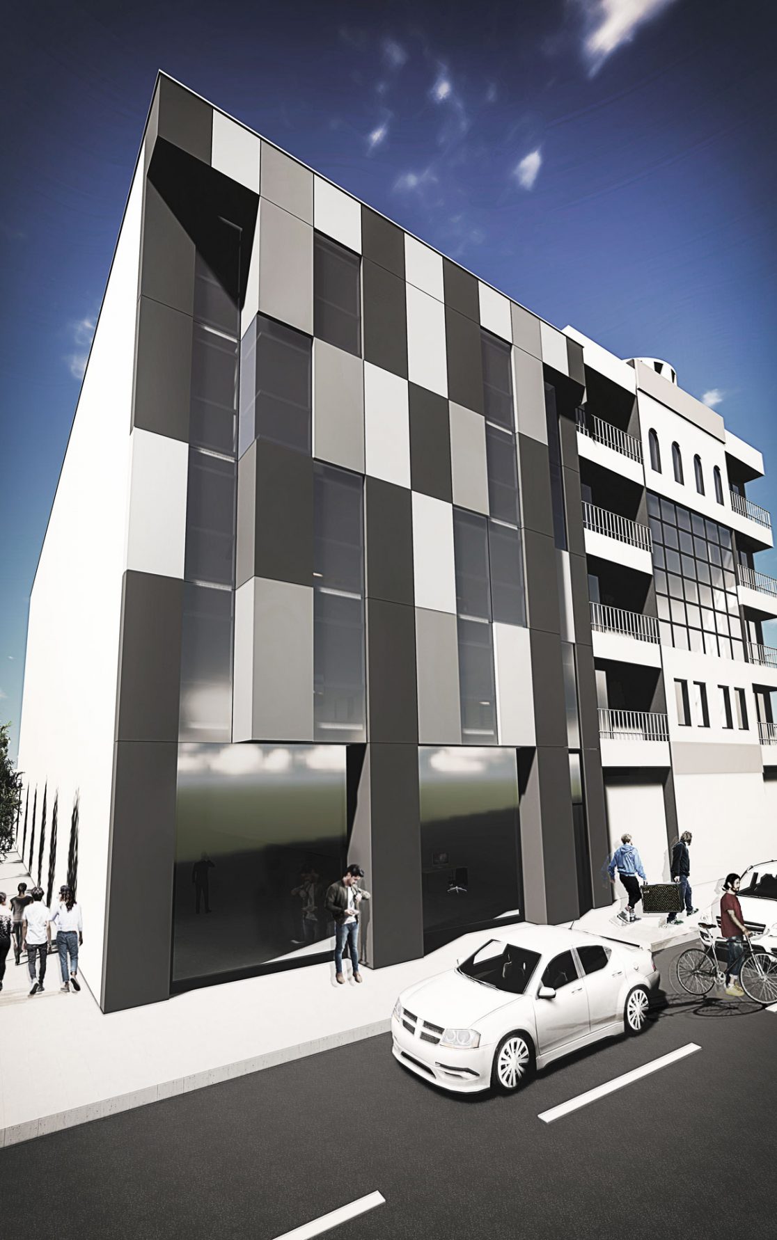 Edificio a destinazione mista, commerciale ed uffici (le funzioni commerciali sono previste al piano terra mentre quelle amministrative ai piani superiori), caratterizzato da una facciata vibrante tramite il gioco cromatico dei pannelli in alluminio compositi e serramenti a taglio termico. La facciata svolge un ruolo fondamentale per l’intero sistema edilizio sia dal punto di vista estetico ma soprattutto dal punto di vista dell’efficienza energetica.